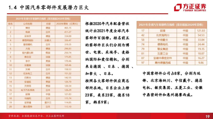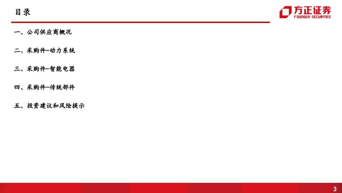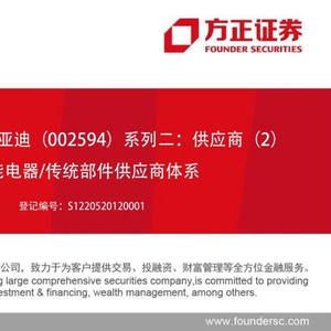 3、比亚迪供应链放量是整个汽车产业链国产零部件公司崛起的缩影。公司百强零部件供应链中,中国企业只有8家,和国产汽车的市场地位极不匹配。过去以外资、合资为主的主机厂,国产供应商很难进入其供应链体系,随着国产新能源汽车的放量,电池率先放量并走出国门,其他零部件也将迎来同样的机会。类似特斯拉供应链成就了拓普集团等的国产供应商,比亚迪的快速放量,也会成就更多的国产供应商,形成家电、手机等行业占领全国并走向世界成功案例。