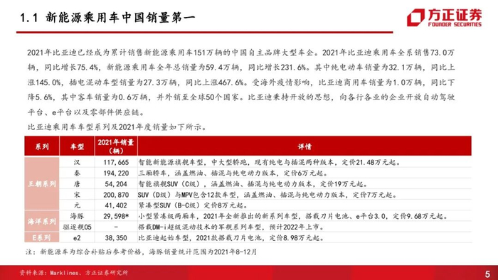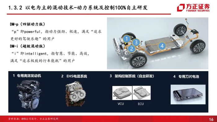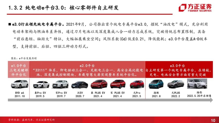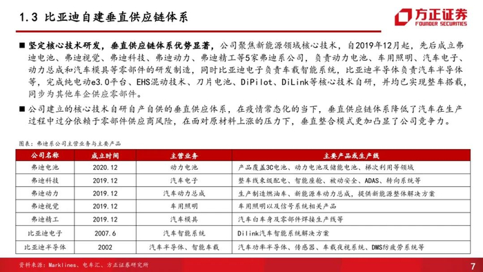 2、垂直供应链体系是比亚迪的特色,将来自给率会下降,逐渐加大开放力度。公司自建供应链,自主研发电池、电机、电控等核心零部件,覆盖核心零部件的自研自产自销全部环节,打造了垂直供应链体系,能够更好地应对原材料价格上涨与疫情反复的困境,保障公司产销顺畅。2019年-2021年期间,比亚迪将旗下零部件事业部转化为子公司,各零部件公司将自主运营,不止为比亚迪配套,还为其他车企供应零部件,这些公司总称为弗迪系零部件公司,和其他外部供应商公平竞争。