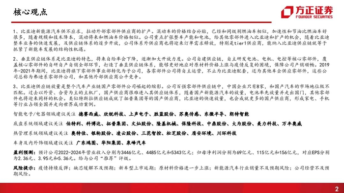 1、比亚迪新能源汽车供不应求,拉动外部零部件供应商的扩产。混动车的价格结合补贴,已经和同级别燃油车相似,加速性和节油比燃油车好很多,随着规模和技术降本,混动将来和燃油车价格相似。公司重点扩张整车产能和电池,给其他零部件进入比亚迪和扩产的机会,随着比亚迪整车业务的快速发展,及供应链体系的逐步开放,公司体系外供应商也将迎来订单需求释放,特别是tier1供应商,能纳入比亚迪供应链就等于抓紧了新能车发展的结构性机遇。