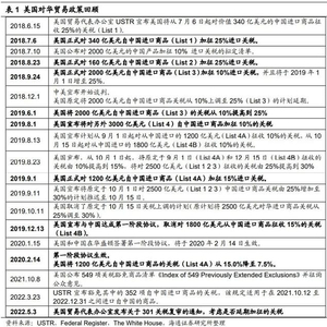 当前背景:2018年美国对我国加征的部分关税即将4年期满到期。到了今年,美国在2018年实施的对华进口商品加征关税措施已持续将近4年,其中针对160亿和340亿美元商品(List 1、2)的加征关税行动将分别于今年的7月6日以及8月23日到期。因此,针对前述两个即将到期的关税加征,美国贸易代表办公室于2022年5月3日正式发起了关于301关税复审的通知:作为复审第一步,美国贸易代表办公室首先会通知此前从加征关税行动中受益的美国企业关于加税可能终止的情况,并提供他们可以申请延长加征关税期限的机会。而若在加征关税行为4年期满的前60天内,美国贸易代表办公室没有收到美国利益相关方要求延续加征关税的请求,那么对应中国进口商品被加征的关税会自然到期终止。值得注意的是,除了前述两个已经在复审流程的关税加征措施外,2018年9月美国针对2000亿美元中国商品(List 3)加征的关税也即将到期。