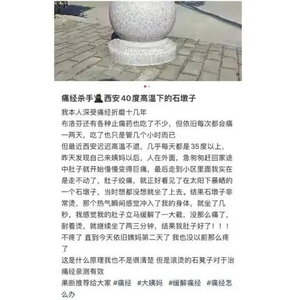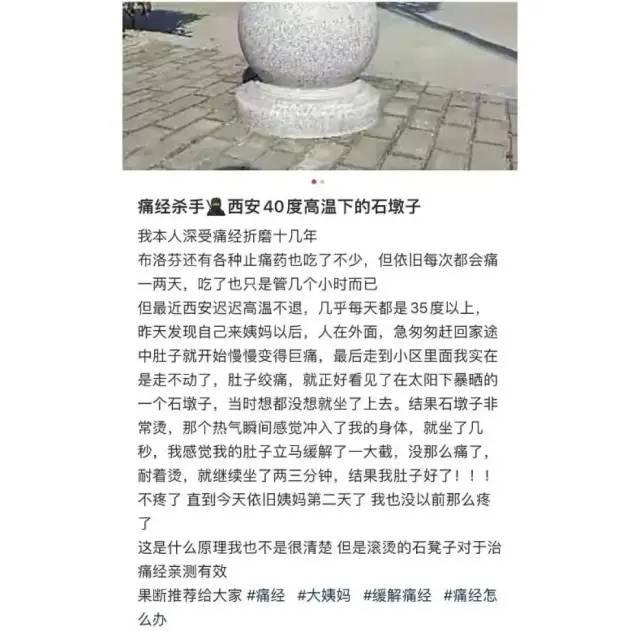 近日,陕西西安的一名女生发文分享自己因为坐了40度高温下的石墩子,缓解了多年的痛经而引发大量讨论。