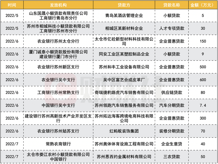 其中,授信金额最高的来自于农行吴中支行向辖内小微企业吴中区富艺合成皮革厂发放“数币”普惠贷款600万元,其次为农行苏州新区支行发放的一笔500万元贷款,用于一家工业设备企业支付货款和代发工资。