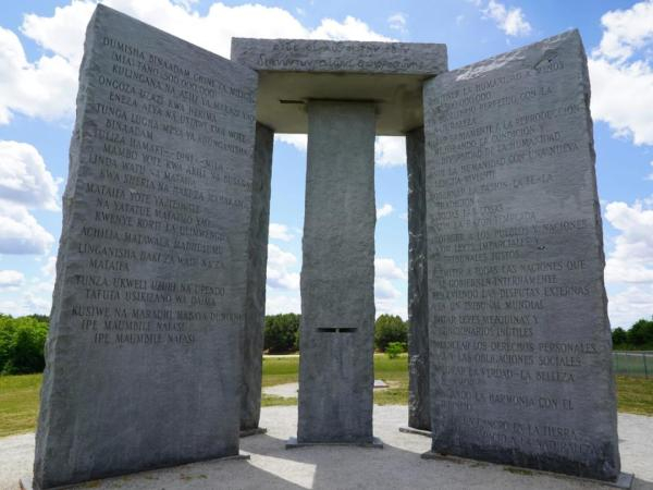 从美国媒体的报道来看,被“强拆”的这座巨型石碑阵名叫“佐治亚指引石”(georgia guidestones),是一个身份不明的男子花大价钱请当地一家花岗岩雕刻公司在1980年3月22日竖立起来的,石碑上还有地理方向的指示、一个日冕设计和指向北极星的标记等等。
