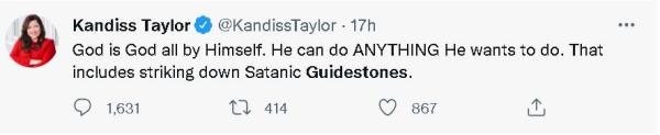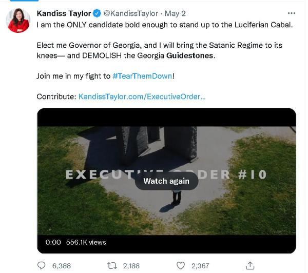 然而,自2016年特朗普成为美国总统以来,被他的成功所刺激到的美国共和党政客便也开始复制起了特朗普迎合美国民粹主义和宗教保守势力的竞选模式。于是,正在参选佐治亚州州长的当地共和党政客坎迪斯·泰勒(kandiss taylor),就多次咒骂甚至威胁要拆除这个“魔鬼的指引石”。