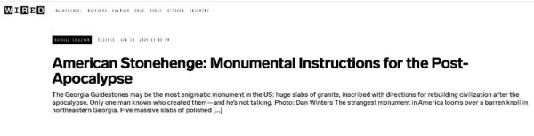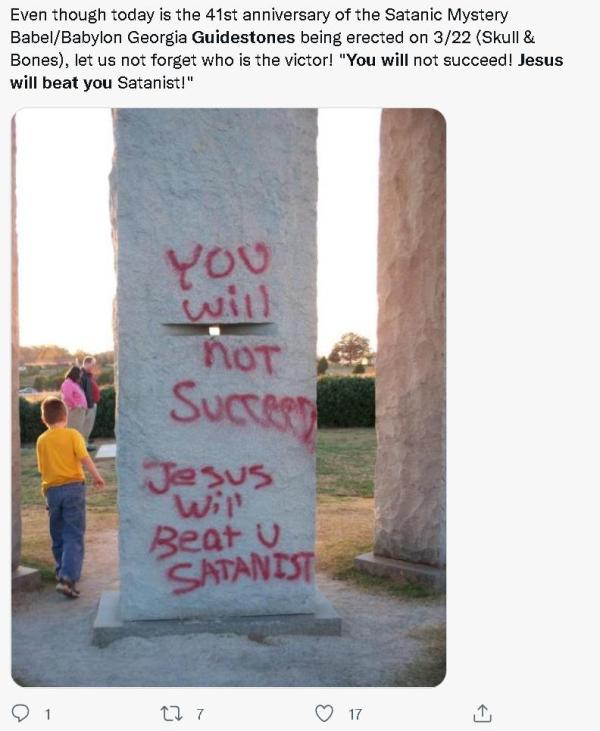 然而,恰恰是那10段文字,令这个后来被人们称作“美国巨石阵”(american stonehenge)的建造物在过去42年的时间里成为了美国宗教保守派敌视的目标。尽管没有拿出任何经得起科学检验的证据,但一些人坚持认为,这10段文字是“魔鬼的教义”,是反对基督教的邪教设置的,目的是通过控制乃至消灭地球的人口,由“魔鬼”代替“上帝”来建立“新的世界秩序”,最终把人类聚集在一起去“反抗”上帝。