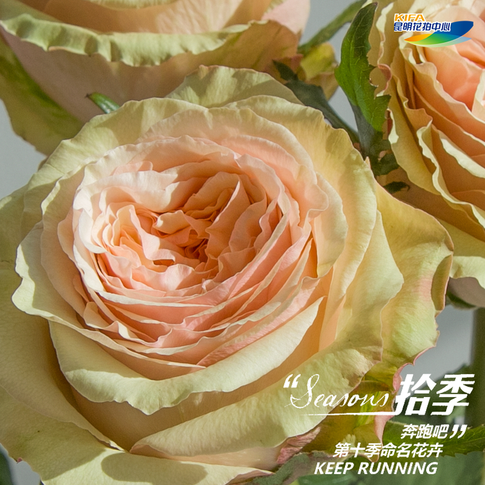 ‘拾季’是锦科自主研发的单头品种,高级的香槟粉色,奥斯汀花型,莲座状,大花型,产量200-400枝/㎡/ 年,瓶插期10-14天,枝条匀称且高,少刺,抗病性强,花瓣厚实有质感。