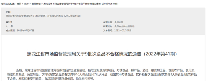 中国质量新闻网讯 2022年7月7日,黑龙江省市场监督管理局发布关于9批次食品不合格情况的通告(2022年第41期)。