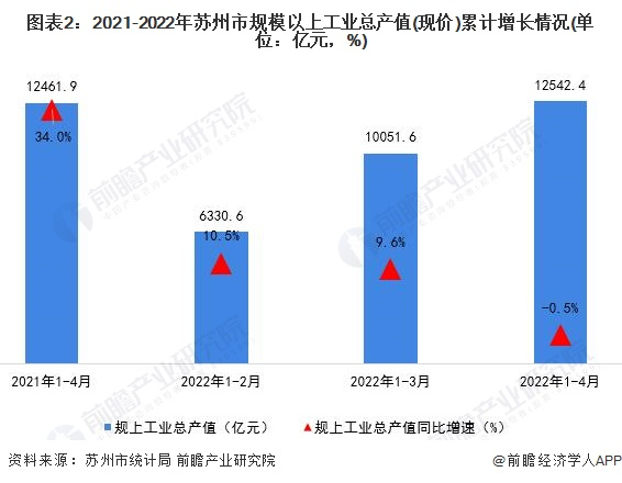 2022年第一季度,苏州工业总产值增速为9.6%。2022年3月底以来,受到疫情影响,工业总产值增速下滑。2022年1-4月,全市规模以上工业企业实现总产值(现价)为12542.4亿元,同比下降0.5%。