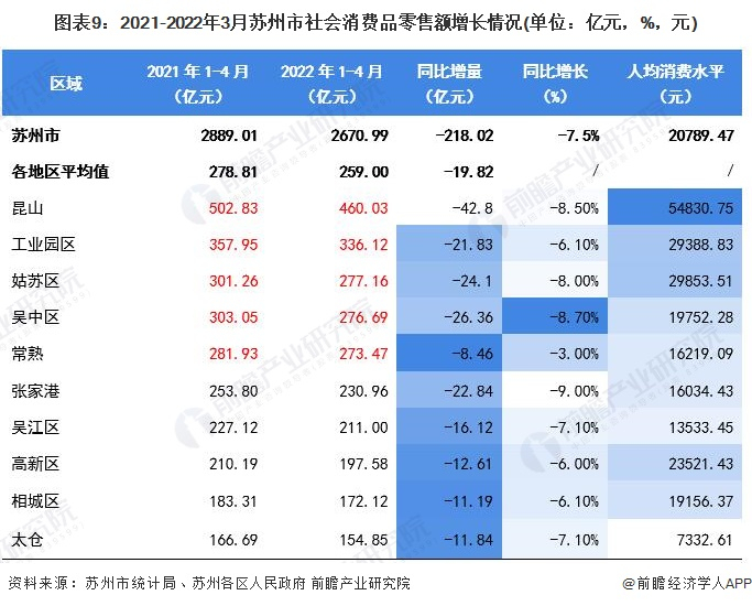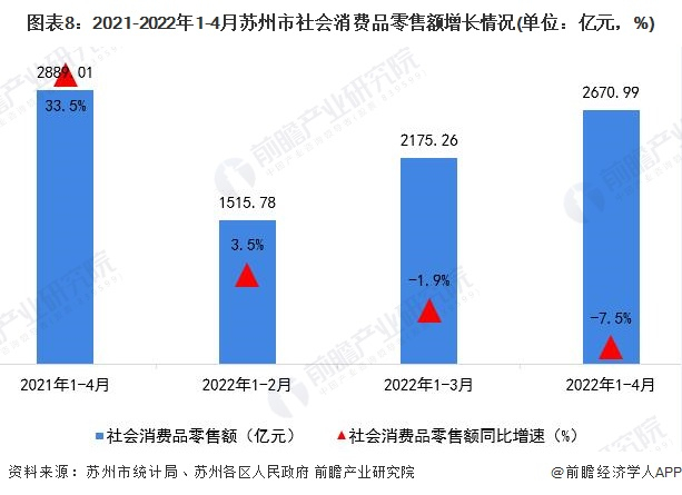 2022年1-4月,苏州市社会消费品零售总额2670.99亿元,同比下降7.5%。其中,限额以上批发和零售业商品零售额为823.80亿元,同比下降11.8%。
