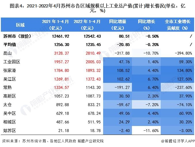 注:①因2022年1-4月苏州市仅公布了规上工业产值现价,与各区的统计口径差异较大,导致各地区合计数远小于本市;②各地区按2022年1-4月规上工业总产值排列,其中标红数据代表该区域规上工业产值超过了各区域平均值;③全市工业增长贡献度=各区域规上工业产值同比增量/全市规上工业产值同比增量