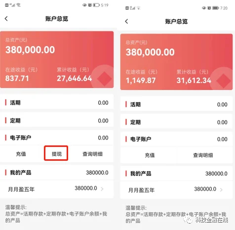 储户提供的资料显示,在App内“电子账户”一栏里,原先有三个选项,即“充值、提现、查询明细”,现在仅剩充值与查询明细通道。另外,点进去“账户可用余额”,转出通道也已经被取消。