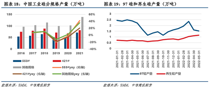 分型号看,中国工业硅主产553#和421#,其中421#占比更高,SMM数据显示,2021年553#产量71万吨,占比24.37%,421#产量81.1万吨,占比27.84%。增速方面,不同型号的工业硅产量均在2021年实现了一波快速上涨,其中553#增长较快,同比增长42%。此外,随着硅产业链的发展,97硅和再生硅等非国标工业硅产量也在不断增长。再生硅是工业硅磨粉、多晶硅以及硅片切片等环节所产生的废料经中频炉回炉熔炼后得到的工业硅,名义硅含量在99%左右。97硅是指由硅石和兰炭在电热炉内冶炼成的产品。不过,这部分超出国标以外的工业硅总体体量较小,2021年全年97硅产量21.68万吨,再生硅产量8.42万吨。
