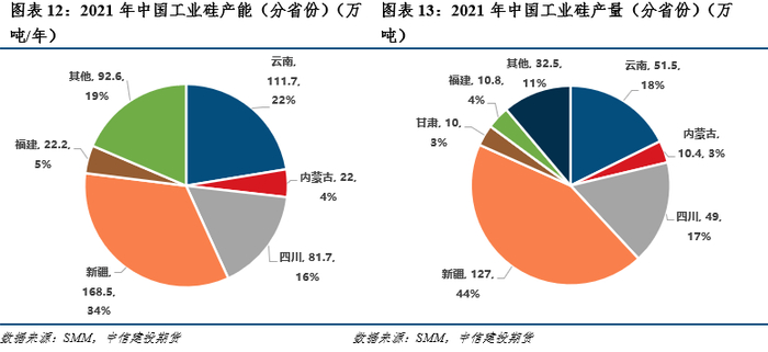 工业硅不同型号生产的区域性特征也较为鲜明。从不同省份的生产情况来看,新疆是通氧553#的主产地,2021年新疆通氧553#的产量为55.1吨,而同样是工业硅主产地的云南和四川,该型号产量仅为3.2万吨和4.2万吨。421#方面,新疆、云南、四川产量相近,分别为39万吨、24.1万吨、27.6万吨,从占比看,云南和四川是421#的主产地,421#产量在云南和四川占比分别为46.8%和56.33%。