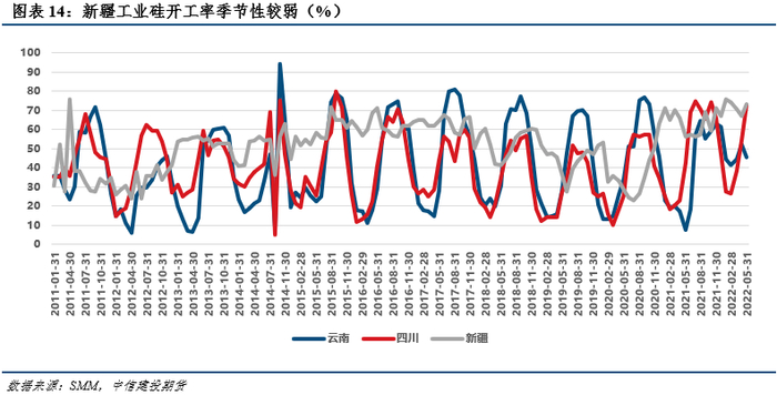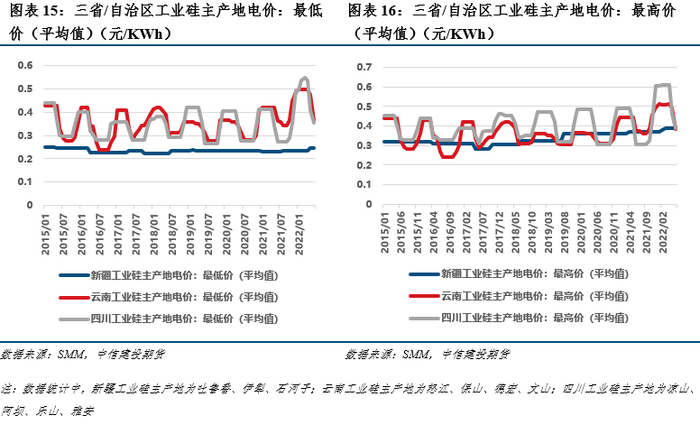 受益于火力发电的稳定电力供给,新疆所采取的“火-电-硅”生产模式使得其开工率较为平稳,季节性较弱。而云南和四川则采取“水-电-硅”的生产模式,在枯水期电力成本上升,企业会选择减产以保障经济性,所以在每年的12月至次年5月两省的开工率较低,一般在30%以下,而同期新疆开工率则保持在50%左右,但在丰水期,开工率之间的差距会相对缩小。此外,新疆电力成本也要优于云南和四川,新疆工业硅主产地的平均电价约为0.23-0.33元/KWh,而云南和四川这一数值分别为0.36-0.37元/KWh、0.35-0.4元/KWh。