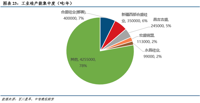 综上所示,目前全球工业硅供应的产能产量集中于中国,从量上看国内工业硅具备明显优势。具体到区域来看,国内工业硅供给多数源自于新疆,由于发电方式差异,新疆电力成本更低,且季节性更弱,开工率在多数时要高于云南和四川这两个工业硅主产地。从生产型号看,我国主产553#和421#,近几年553#产量增速要更快一些,但目前421#利润要高于553#。产业方面,目前工业硅行业集中度偏低,产能过剩和成本上涨等问题也使得厂商承受较大压力,投产动力不足。