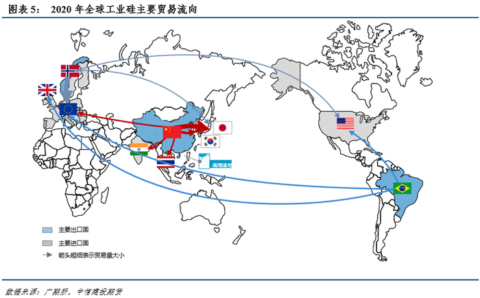 从贸易供应的角度来看,全球每年约有三分之一到四分之一的工业硅通过贸易出口的方式流通到其他国家,主要的生产国即是主要的出口国,中国、挪威和巴西占据了全球工业硅出口额的80%,2020年三个国家的出口量分别为62万吨、21万吨、17万吨,分别占全球出口量的51%、18%和14%。