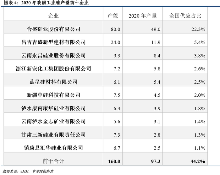 从企业来看,海外主要工业硅生产企业包括美国的Ferroglobe和陶氏,挪威的埃肯和瓦克,巴西的Rima和Liasa,以上企业基本占据了海外70%以上的工业硅产量,可见海外工业硅产业较为集中。相比之下,国内工业硅产业集中度较低,2020年国内供应排名前10的企业工业硅供应占比仅约44%,不过随着合盛硅业、东方希望等龙头企业的扩产,行业集中度有望提高。值得一提的是,我国的小型工业硅企业众多,除了供应排名前十的企业外,我国还有200余家工业硅生产企业运行。