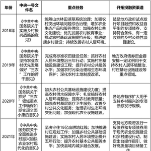 而专项债自2014年问世,到2017年政策红利释放,投向领域持续拓宽,也成为助力城乡发展的重要财政政策工具之一。历年中央一号文件中也反复强调“三农”发展要借助专项债资金,有序扩大专项债资金适用范围,做好高质量项目储备工作。表1对2018年以来的中央一号文件中针对基础设施建设及专项债融资方面的重点内容进行了梳理。