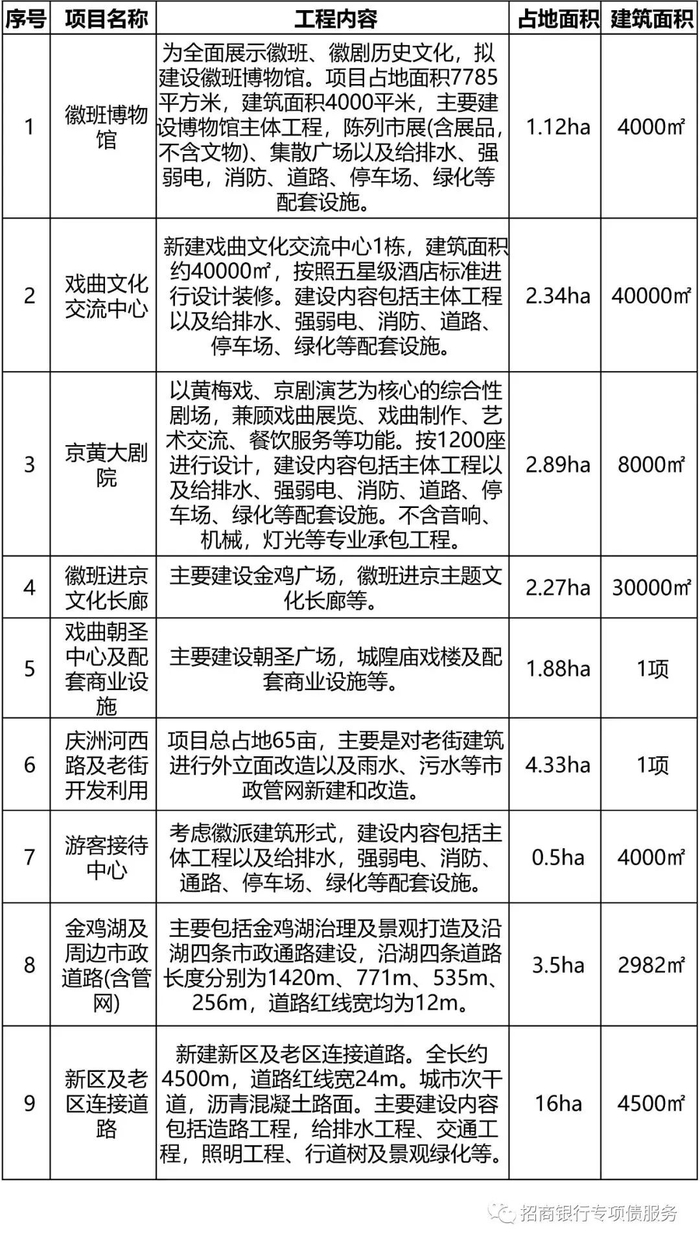 建设内容:项目位于怀宁县石牌镇,建设内容包括徽班博物馆、戏曲文化交流中心、京黄大剧院、徽班进京文化长廊、戏曲朝圣中心及配套商业设施、庆洲河西路及老街开发利用、游客接待中心、金鸡湖及周边道路(含管网)、新区与老区的连接道路等项目,建设内容详见表6。