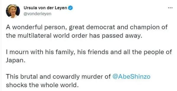 冯德莱恩写道:“我与他的家人、朋友和所有日本人民一起哀悼。这场残酷和懦弱的谋杀震惊了整个世界。”