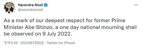 印度总理莫迪刚刚发布推特,表示印度将就日本前首相安倍晋三去世举行一天的全国哀悼。