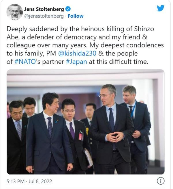 斯托尔滕贝格写道,对安倍晋三遭受“令人发指的杀害深感悲痛”,“在此艰难时刻,我向他的家人、日本首相(岸田文雄)和北约的伙伴——日本人民致以最深切的哀悼。”