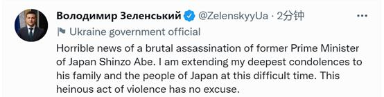 乌克兰总统泽连斯基刚刚发推就日本前首相安倍晋三去世表态。