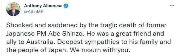 阿尔巴内塞写道:“对日本前首相安倍晋三的不幸去世感到震惊和悲痛。他是澳大利亚的好朋友和盟友。向他的家人和日本人民致以最深切的同情。我们和你们一起哀悼。”