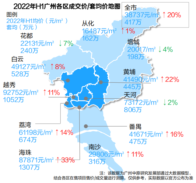 上半年,广州房价,依旧在涨,并且涨幅还不低!据广州中原研究发展部数据显示,2022年1-6月,广州全市成交均价为38737元/㎡,环比上涨20%。