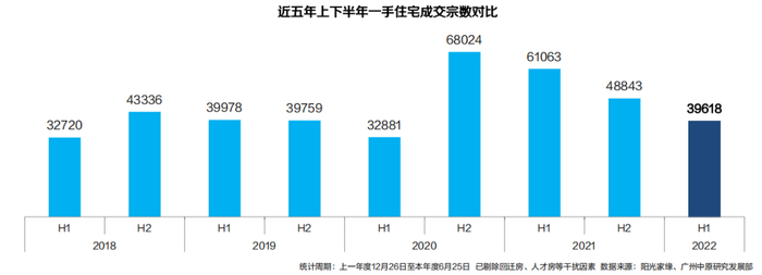 2020年上半年,广州成交32881套新房;2019年上半年,39978套;2018年32720套。