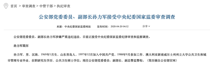 2020年4月20日,时任公安部党委委员、副部长孙力军被查。2021年9月30日被双开。