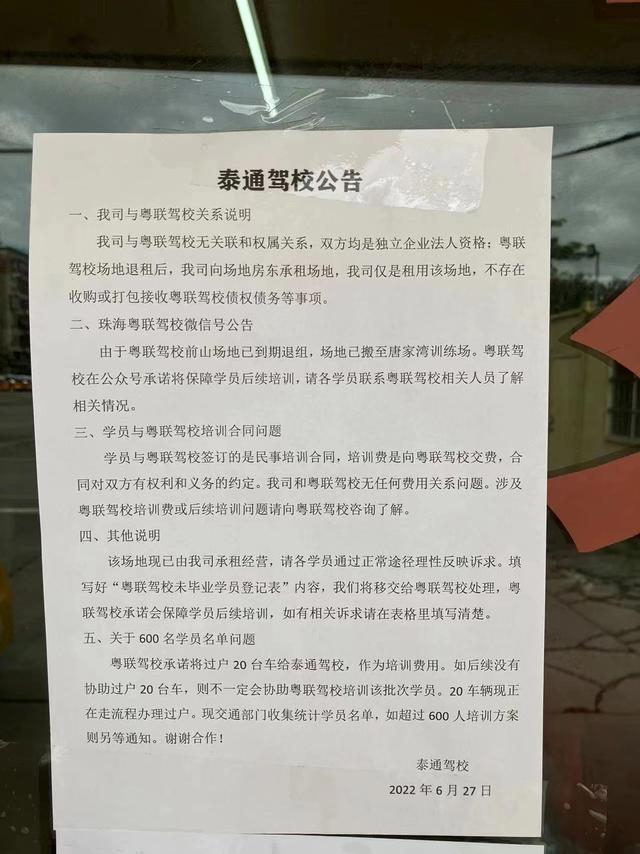 6月27日,泰通驾校发布的公告称与粤联驾校无关联。