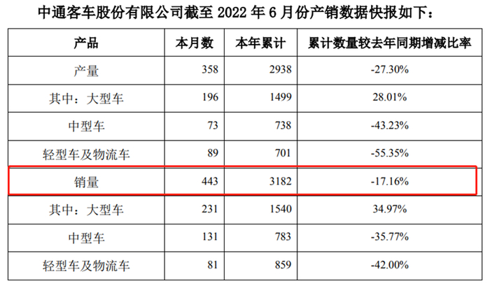 值得一提的是,就在昨日晚间,中通客车披露了2022年6月份产销数据。公司6月产量358量,本年累计产量2938辆,同比下降27.3%;6月销量443辆,本年累计销量3182辆,同比下降17.16%。