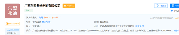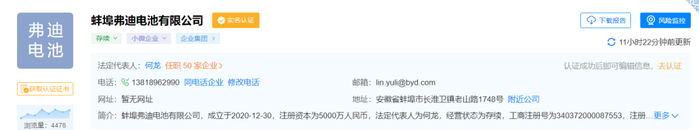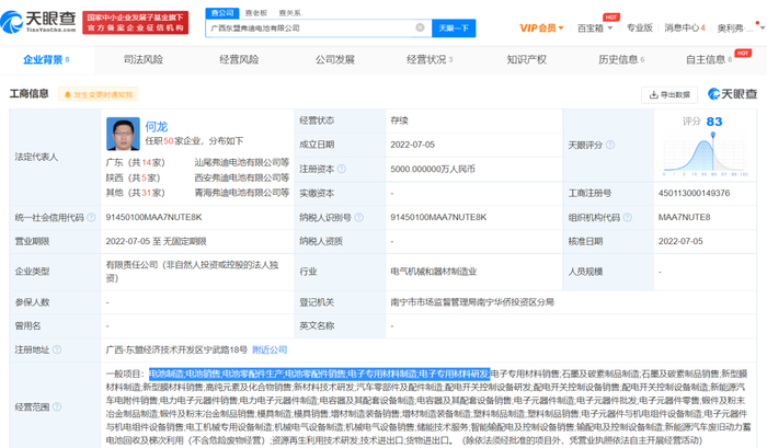 天眼查显示,广西弗迪的注册资本5000万元,法定代表人为何龙,经营范围包含:电池制造、电池销售、电池零配件生产、电池零配件销售、储能技术服务、新能源汽车废旧动力蓄电池回收及梯次利用等。