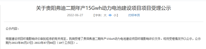6月27日,贵阳市生态环境局公布文件显示,弗迪电池将在贵州省贵阳扩产,修建二期厂房,年产15GWh动力电池,项目总投资30.17亿元。