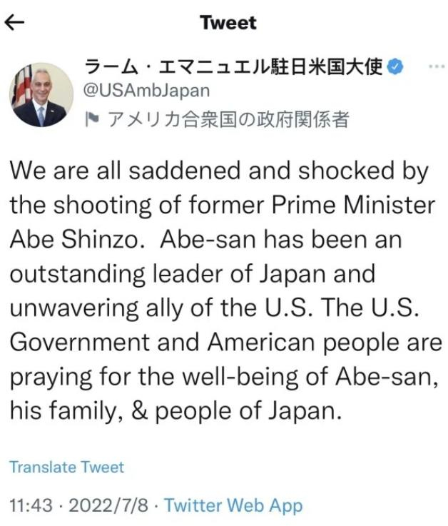 美国驻日大使拉姆・伊曼纽尔(Rahm Emanuel) 7月8日发布推特表示,对前首相安倍晋三的枪击事件感到悲痛和震惊。安倍是美国的坚定盟友,美国正为安倍晋三、他的家人及日本人民祈福。