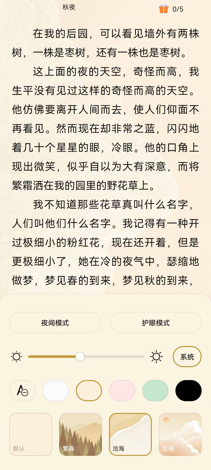 除了听书,作为“读书”的忠实拥趸,华为阅读此番以国风传统五色为基调,设计并上线了一套全新的诗意色系,分别为:“既白”“黄栌”“红酥”“青苔”“月黑”。每一种都由各自不同的图案、纹理、颜色组合而成,其中也包含了各自不同的设计理念与意蕴,所有的颜色设计都取自于诗词,像是“红酥”就出自陆游的名诗“红酥手,黄滕酒,满城春色宫墙柳。”设计师以原诗爱意为基调,透过颜色倾诉出其中的婉转缠绵之意。低饱和度调色搭配纸感的设计也能够很好地缓解读者的视力损耗,从视觉上带给读者一份别样的舒适。新增的“繁森”“沧海”“空镜”三种自然主题,也让人眼前一亮,搭配不一样的背景颜色会呈现不一样的效果,十分有趣。