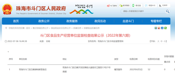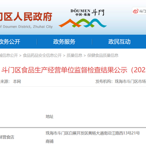 中国质量新闻网讯 据广东省珠海市斗门区人民政府网站2022年7月6日消息,珠海市斗门区市场监督管理局发布《斗门区食品生产经营单位监督检查结果公示(2022年第六期)》。