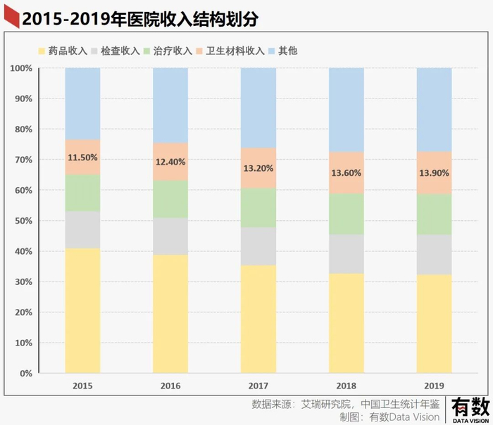 在医院的收入结构里,药品收入是第一大头,占比接近三分之一,其次是检查治疗收入,但这些收入历年有所下降,取而代之上升的是另一种我们平时没有注意过的收入:卫生材料收入。