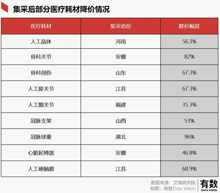 根据艾瑞咨询的数据显示,集采之后无论是药品还是医疗耗材均出现大幅度杀价情况,其中湖北医保局下手特别狠,冠状球囊耗材降价96%,即使降价幅度最小的江苏双腔起搏器降幅也在15.9%。