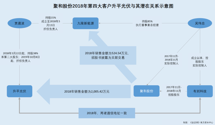 这意味着,2018年,聚和股份与吴伟忠控制的九陵新能源发生关联交易,当年4月即中止。而在中止的一个月前,即2018年3月,九陵新能源的少数股东贾晨波成为升平光伏负责人。同年,升平光伏即进入聚和股份前五大客户之列。