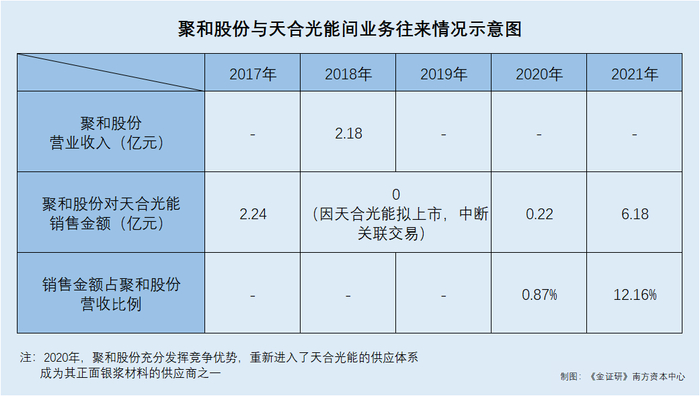 对此,聚和股份披露称,2020-2021年,聚和股份向天合光能(控制企业)的销售金额分别为2,173.24万元、61,827.35万元,占聚和股份当期营业收入的比例分别为0.87%、12.16%。