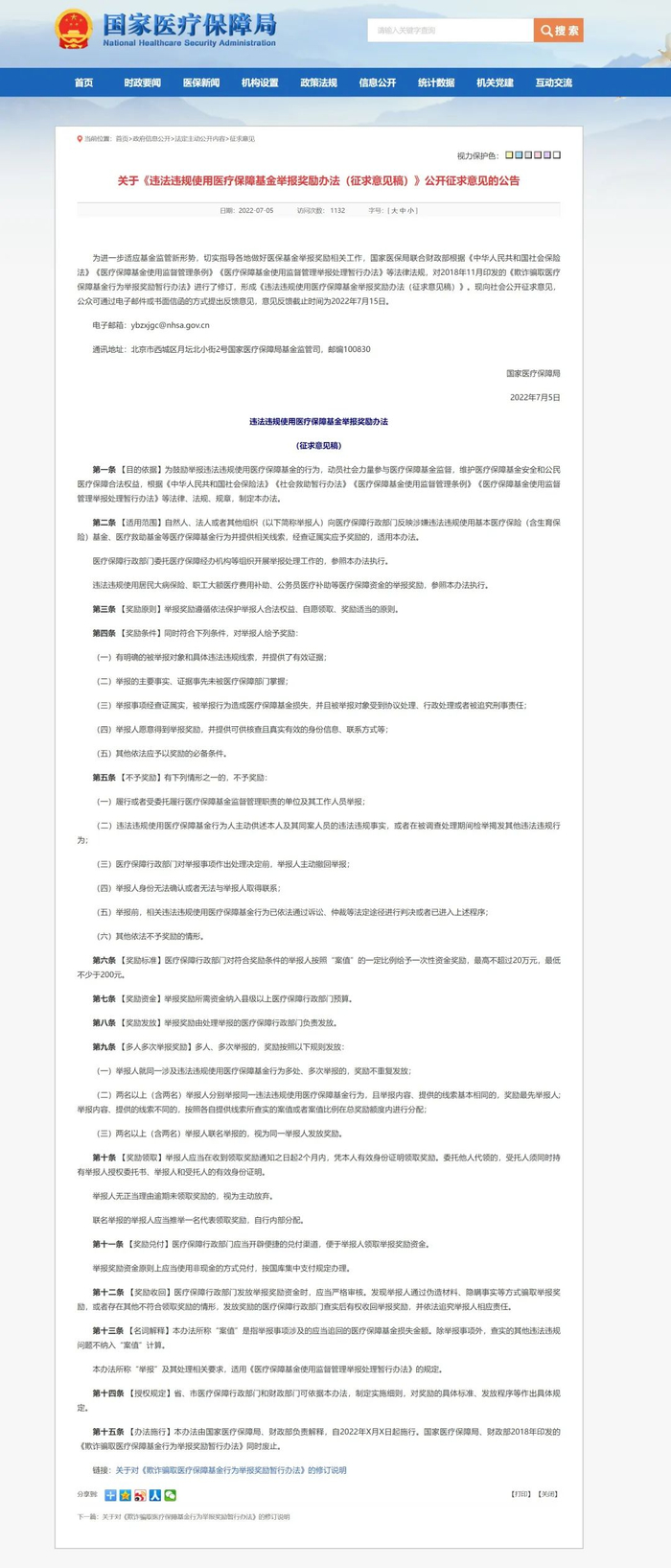 国家医疗保障局日前发布《关于违法违规使用医疗保障基金举报奖励办法(征求意见稿)公开征求意见的公告》,拟将举报奖励的范围从欺诈骗保行为扩展到所有违法违规使用医保基金的行为,并大幅提高奖励标准,奖励上限由10万升至20万元。