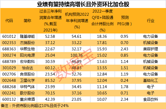 数据宝统计,今年一季度外资持股(QFII+北上资金)环比加仓股超千只,外资持股比例超过10%但低于24%,且过去三年(截至2021年)净利润复合增速、机构预测2022年、2023年净利润增速均超过20%的公司仅有11家,主要分布在电力设备、机械设备及电子等热门赛道,包括阳光电源、宏华数科、华特气体等。