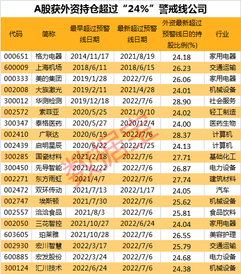外资持有20股比例曾超过预警线