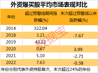 整体上看,外资爆买股表现较为强势。从超过预警线期间(首次至最近触及预警线的区间)市场表现看,2019年及以前入围公司的赚钱效应显著,2020年以来超过预警线期间的公司平均涨幅均低于10%。