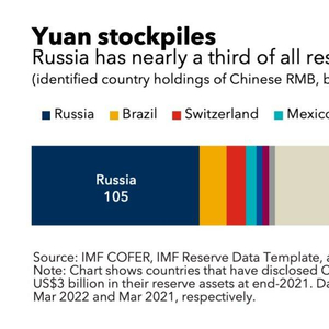 2021年末人民币在俄罗斯外汇储备占比高达17%,仅次欧元33.9%,黄金21.5%;美元仅占10.9%;由于一季度美国联合欧洲各国对俄罗斯投下金融炸弹,把俄罗斯踢出全球交易系统;在2022年一季度,俄罗斯基本清空美元外汇储备,预计最新数据出来,人民币在俄罗斯的外汇储备占比中将仅次于欧元;