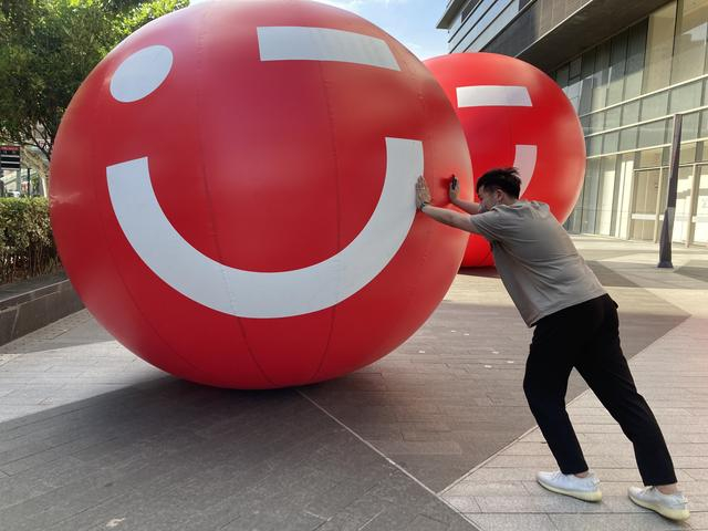 记者注意到,三个巨大的红色“笑脸不倒翁”错落有致地摆放在广场空地上,球身上印有”保持微笑,上海难不倒“的字样。用力推动球体,球神既不会移位也不会倒下。现场,不少游客路人开心地和装置互动,玩得不亦乐乎。