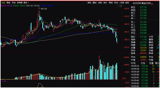 国内市场,以黄金期货报价为例,行情数据显示,7月8日,国内黄金期货主力合约报377.04元/克,下跌0.31%,近期该合约创出最近5个月新低。