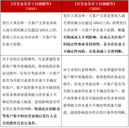 通过对比2018年版和2020年版的《首发业务若干问题解答》发现,超过50%已不必然认定为大客户依赖,并且不再强调扣除客户集中的业绩后是否必须符合发行条件。